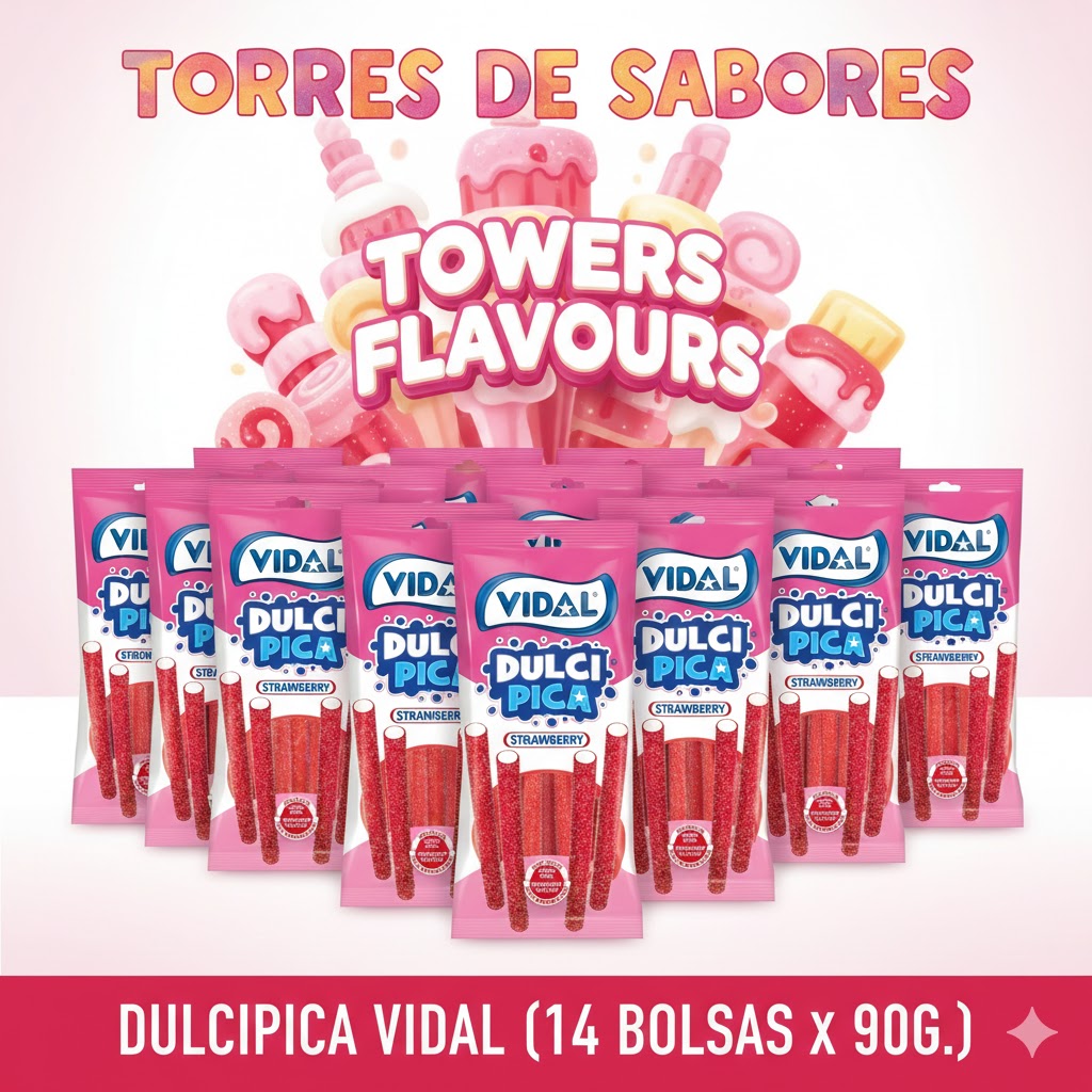 Delicioso regaliz alargado de sabor fresa con un delicioso relleno, cobertura pica. Envase de 14 bolsas de 90g.