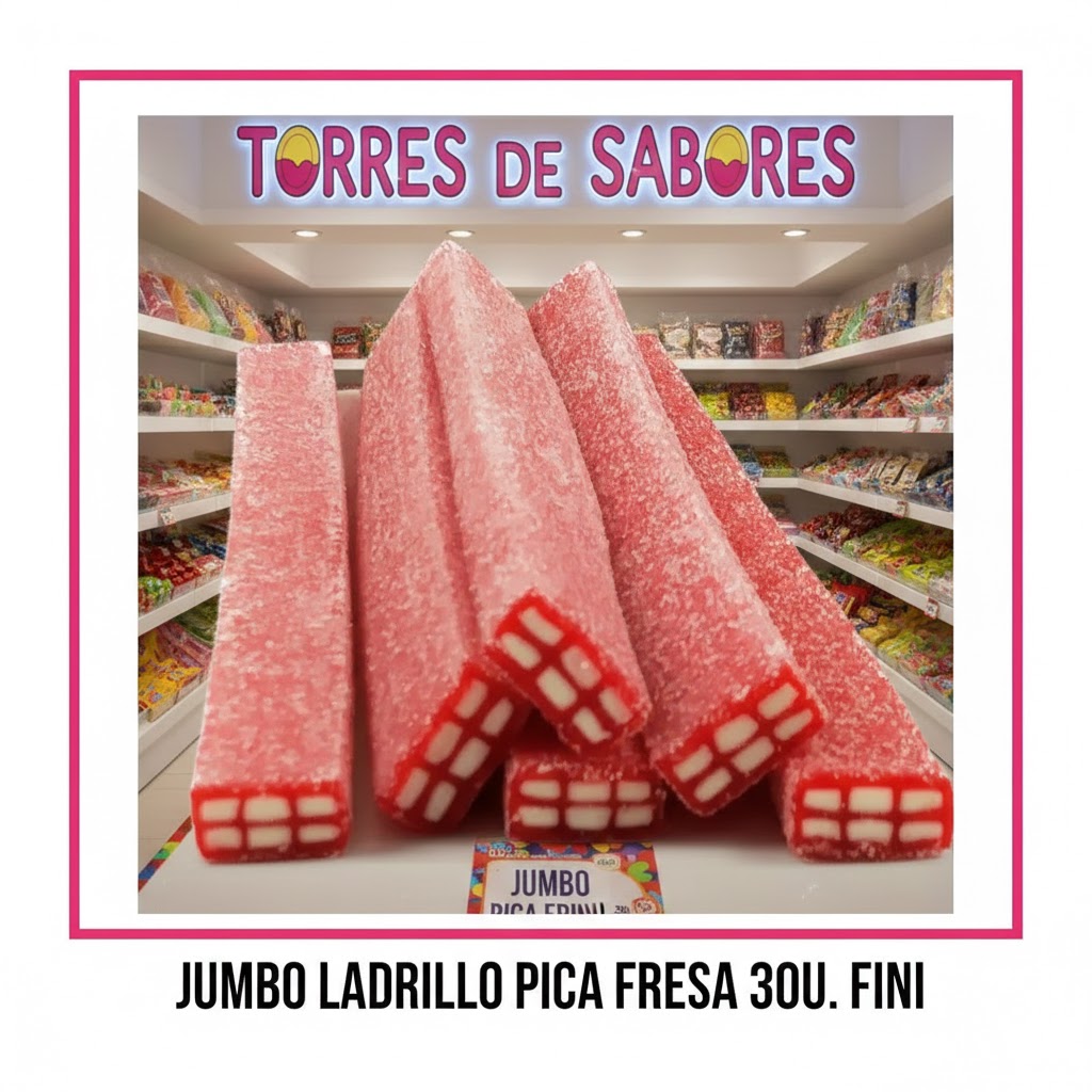 La Regaliz Jumbo Ladrillo Pica Fresa de Fini es una regaliz de 23cm con forma de tocho de fresa y envuelta de pica que se vende en cajas expositoras de 30 unidades.
