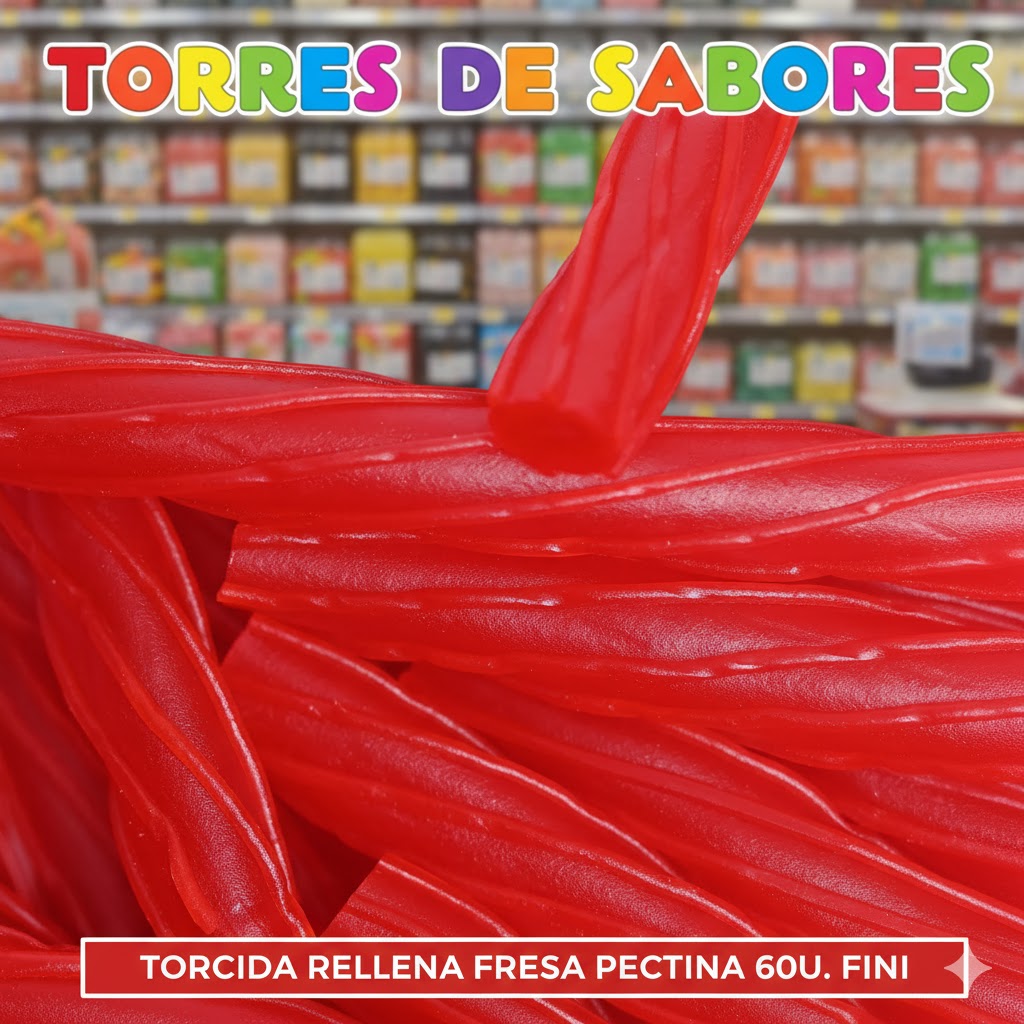 Tarro con 60 unidades de regalices Torcidas Rellenas rojas Fini, con sabor a fresa y rellenas de gelatina. Perfectas para poner en una mesa de chuches, en cumpleaños o cualquier fiesta para darle un toque especial.