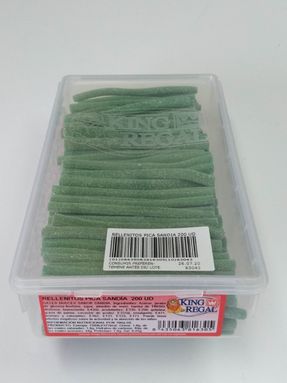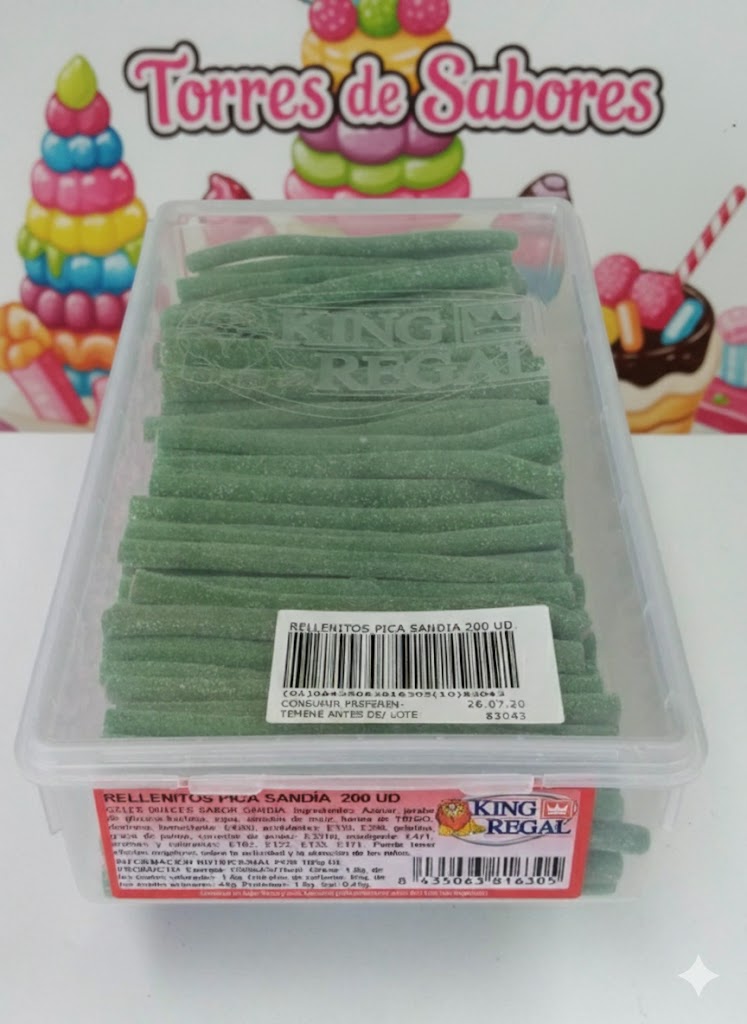Disfruta de King Regal Rellenito Pica Sandía, regalices con un intenso sabor a sandía, un toque ácido y un cremoso relleno en un pack de 200 uds.