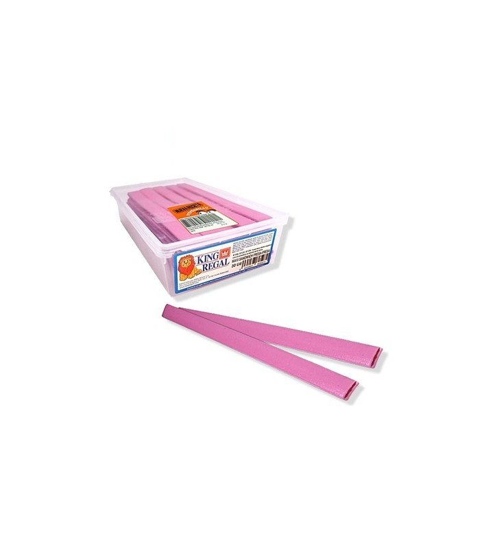Deliciosos geles dulces de azúcar glaseada sabor fresa rellenos de crema de fresa. Presentados en una caja con 30 unidades, medidas aproximadas: 24 x 2cm.