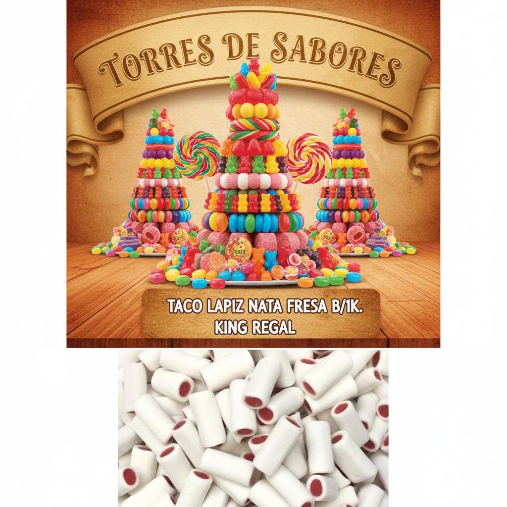 La bolsa incluye 1 kg de tacos nata fresa de King Regal, ideal para compartir, montar mesas dulces o tener siempre una chuche rica en casa.