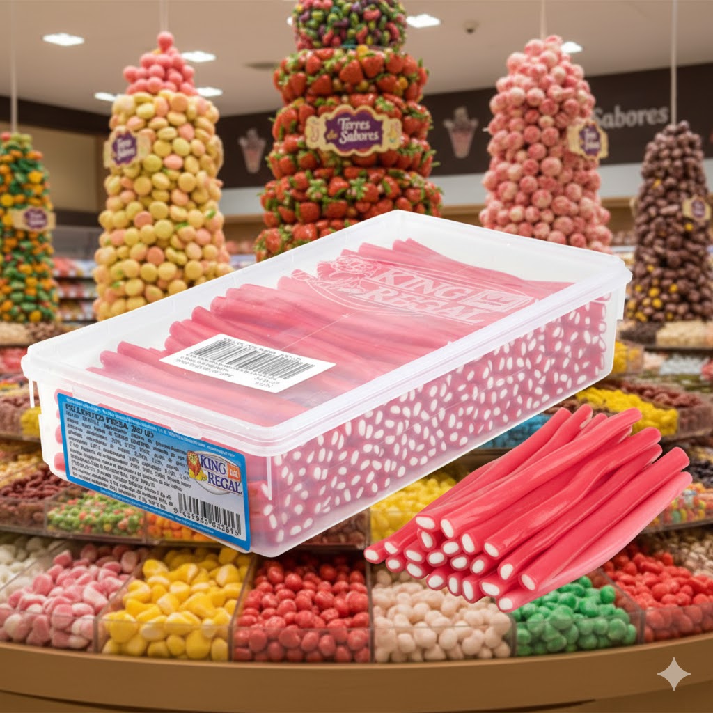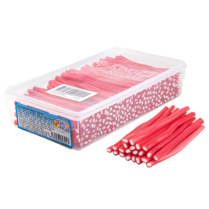 Caja de plástico con 200 unidades de regalices rellenos de color rojo y con sabor a fresa. Son perfectos para servir tal cual, realizar diferentes bolsas de chuches, tartas dulces y todo lo que se te ocurra.