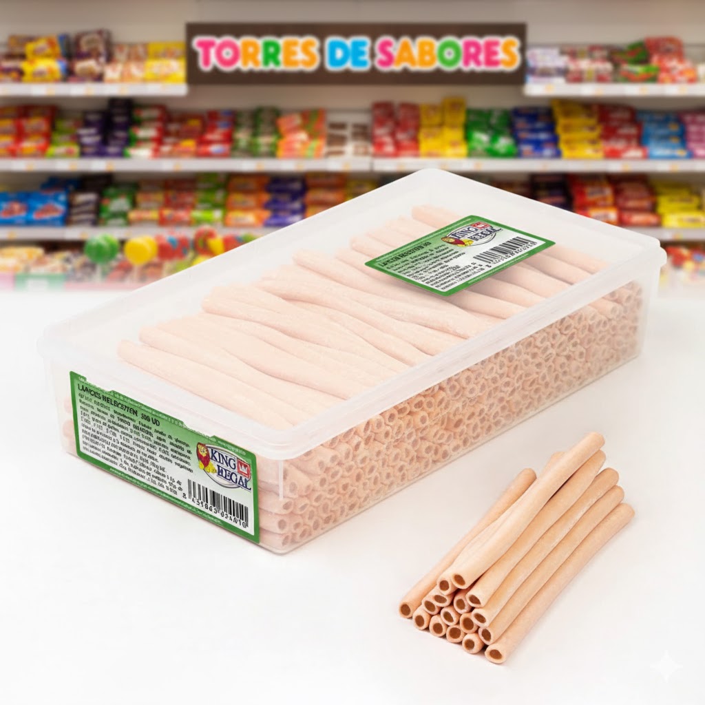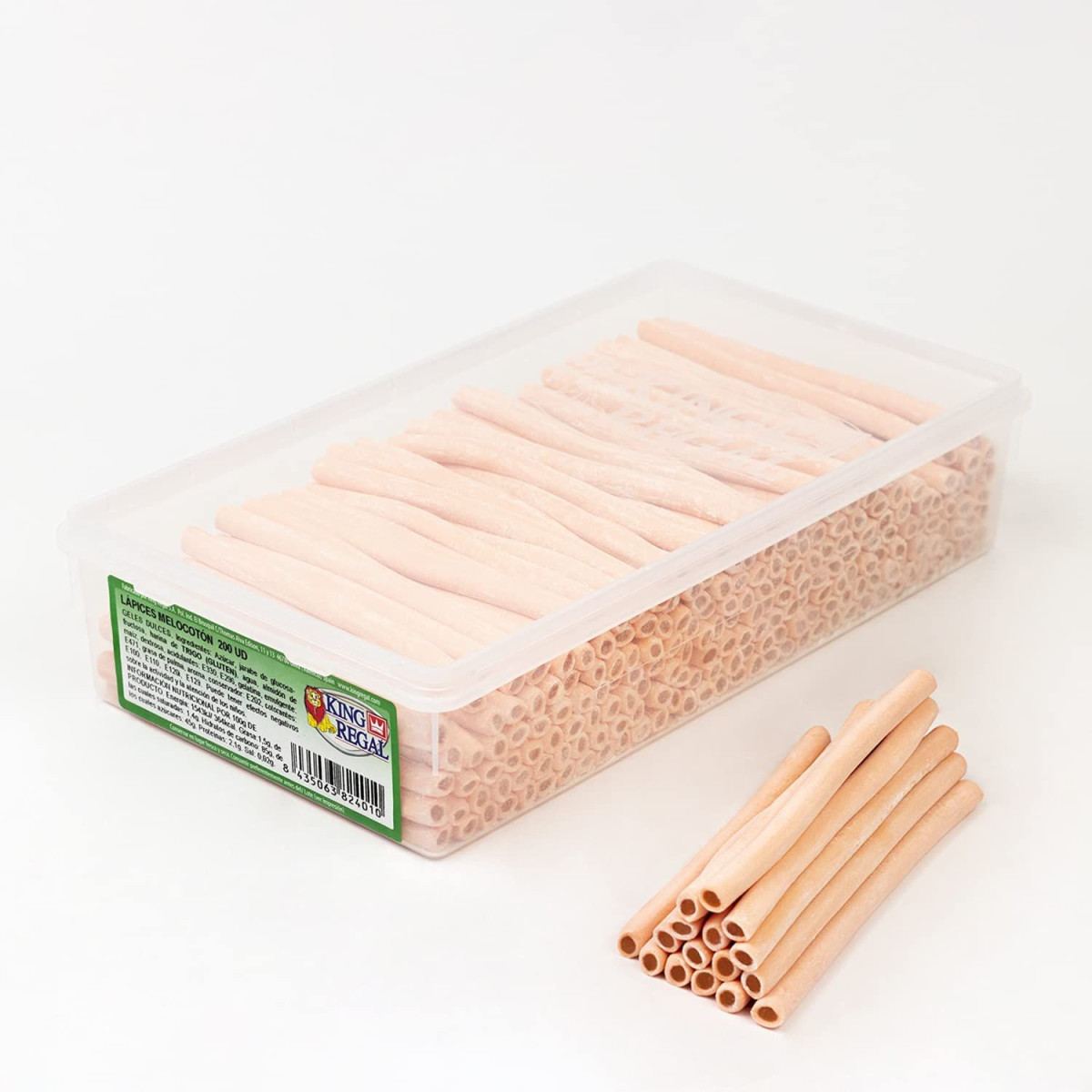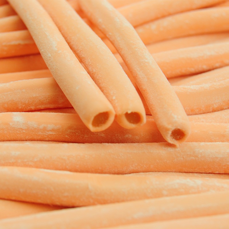 Lápiz de regaliz sabor melocotón, de textura suave, con una cobertura muy fina de azúcar glas y relleno de gel dulce.