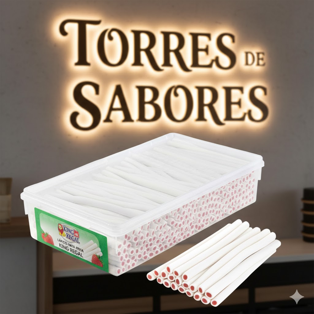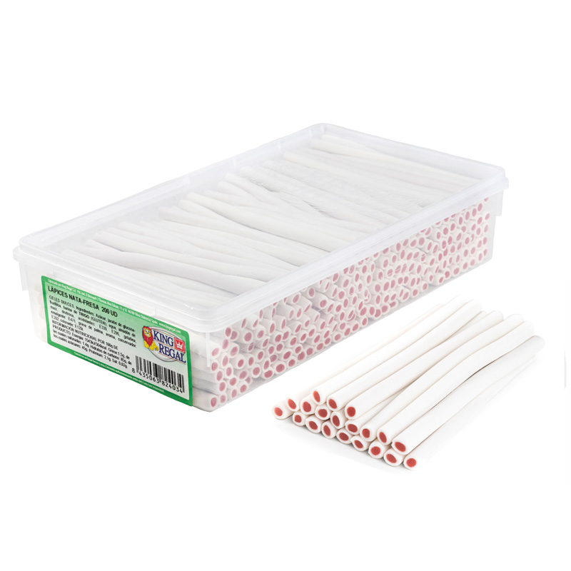 Delicioso regaliz relleno en forma de lápiz y sabor a nata y fresa. Envase de 200unidades.