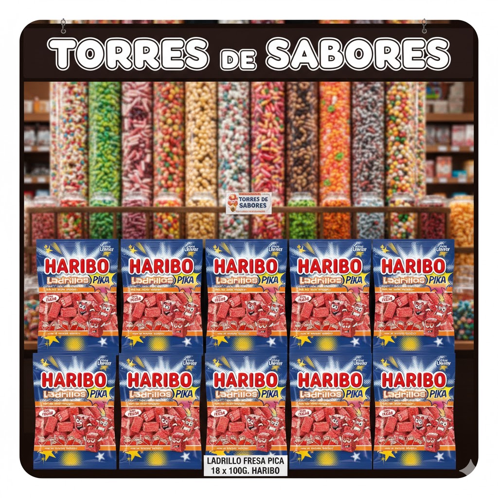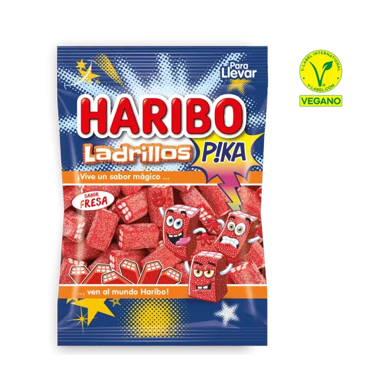 Los LADRILLOS PICA son las clásicas piezas en forma de ladrillo con interior de pasta de azúcar sabor Fresa-Nata y recubiertos de Pica. Presentado en una caja con 18 bolsas, cada bolsa contiene 100 gramos.