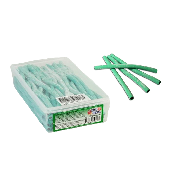 Los Maxi lápices sandía de King Regal combinan una irresistible capa exterior verde con un relleno interior rojo de sabor a sandía. Su equilibrio entre dulzura y frescura los convierte en un regaliz delicioso, colorido y divertido, perfecto para compartir, decorar mesas dulces o disfrutar en cualquier ocasión.