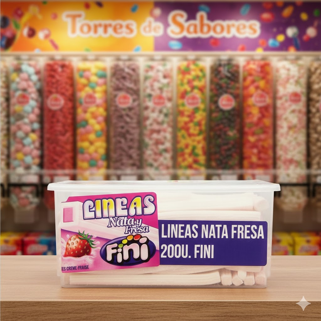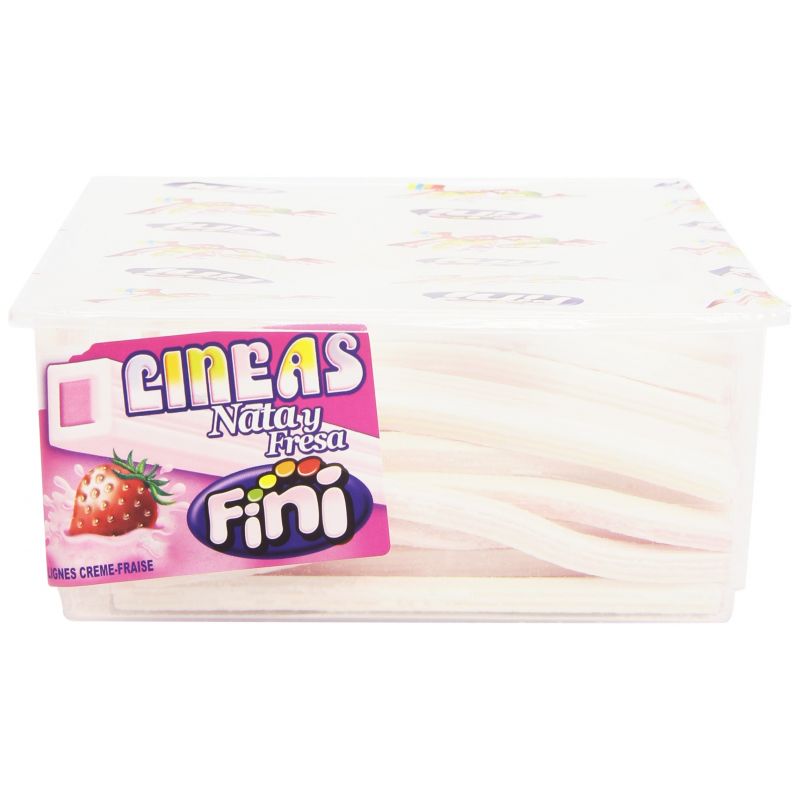 Irresistibles líneas de Fini con sabor a fresa/nata. Contiene 200 unidades de unos 12 cm la unidad.