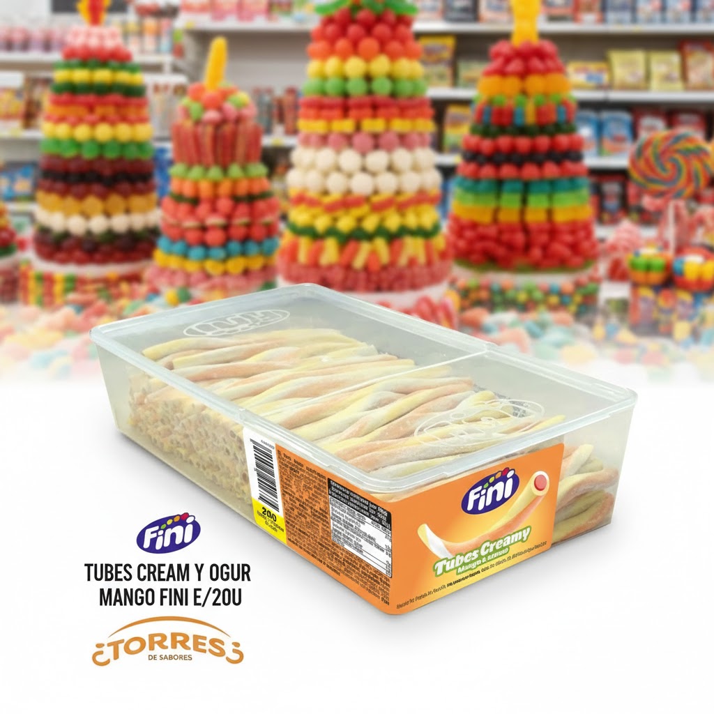 Geles dulces de Fini, con una textura extra cremosa con delicioso sabor a mango y nata. Presentados en un estuche con 200 unidades.