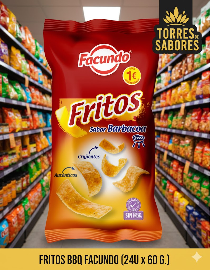 Aperitivo de maíz con forma de tiras y sabor barbacoa. Se sirve en paquetes de 75 gramos cada uno. Caja de 24 paquetes. Sin gluten.