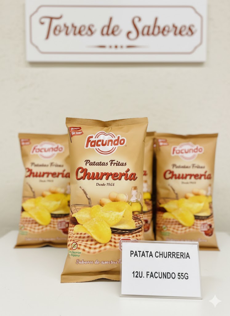 Patata frita de churrería de la marca Facundo, envasada en bolsas de 55g. presentada en caja de 12 unidades.