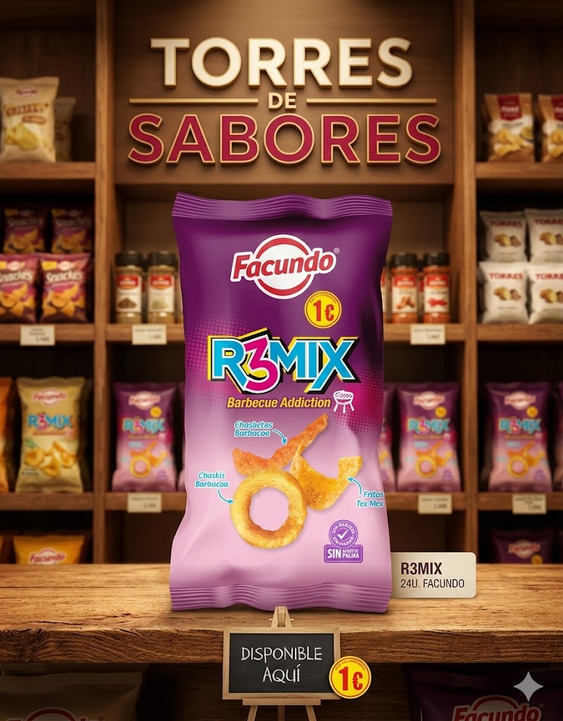 R3mix es una mezcla de snacks con sabor barbacoa de Facundo que incluye Fritos, Chaskis y Chasketos. Se sirve en paquetes de 75 gramos cada uno. Caja de 24 paquetes. Sin gluten.