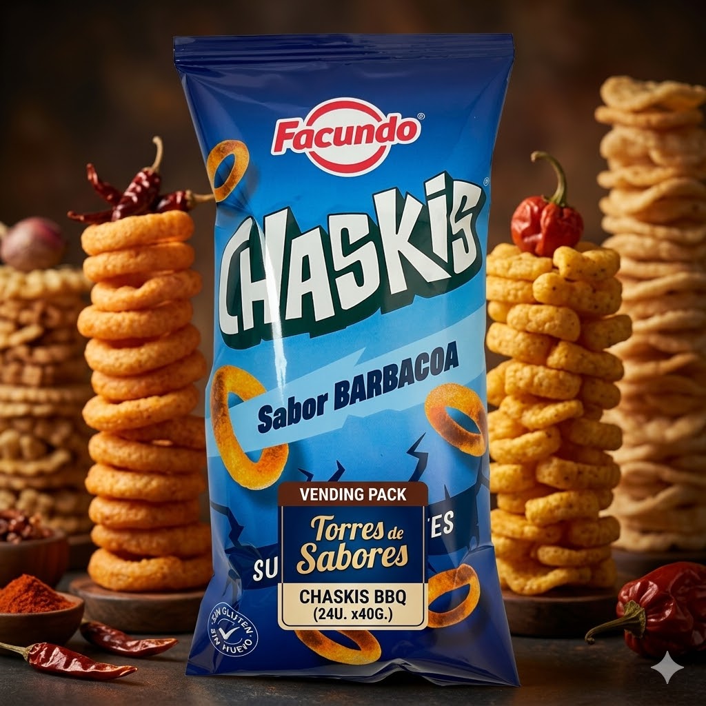Chaskis barbacoa de maíz crujiente con sabor intenso y especiado. Formato de 40 gramos por bolsita, perfectos para venta individual en tiendas de alimentación, cafeterías o máquinas vending.