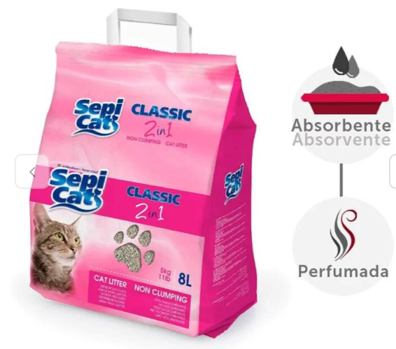 Sepicat Classic 2 en 1 arena absorbente para gatos con arcilla natural, potente acción antibacteriana y suave perfume floral para un arenero más higiénico.